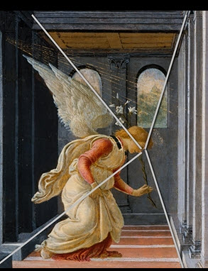 En este cuadro, si extendemos las líneas que forman los límites superior e inferior de las paredes que rodean al ángel (of the walls surrounding the angel), veremos que las líneas convergen en un único punto, situado por delante del rostro (in front of the face) de ángel.