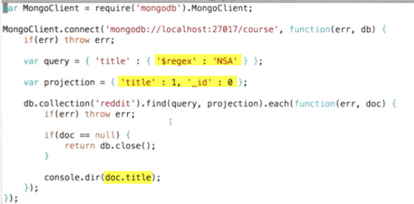 db.reddit.find({ 'title' : { '$regex' : 'NSA'} }, { 'title : 1, '_id' : 0 });